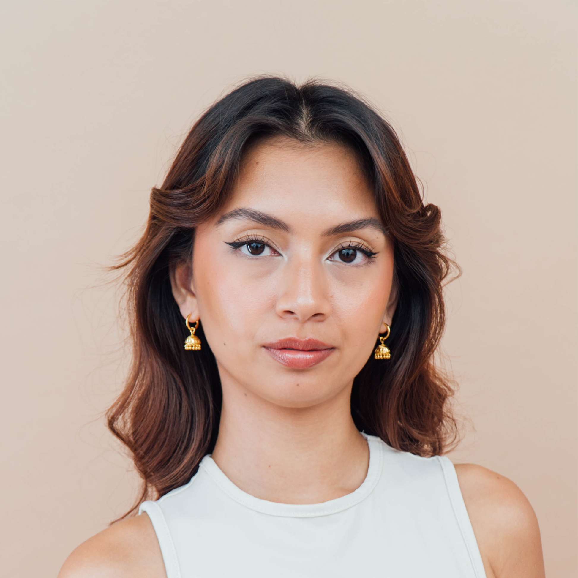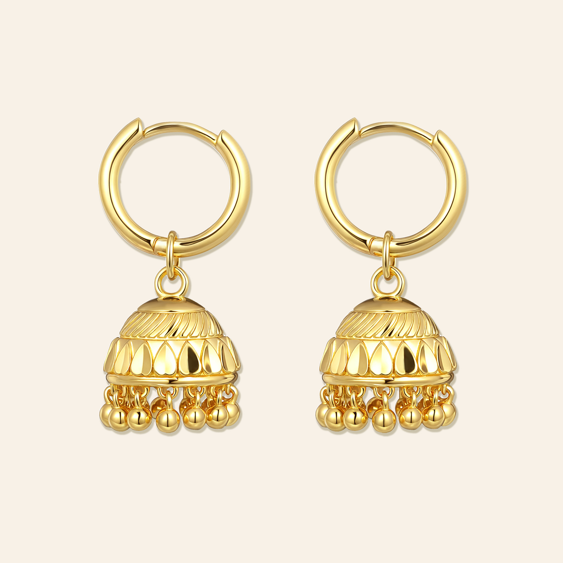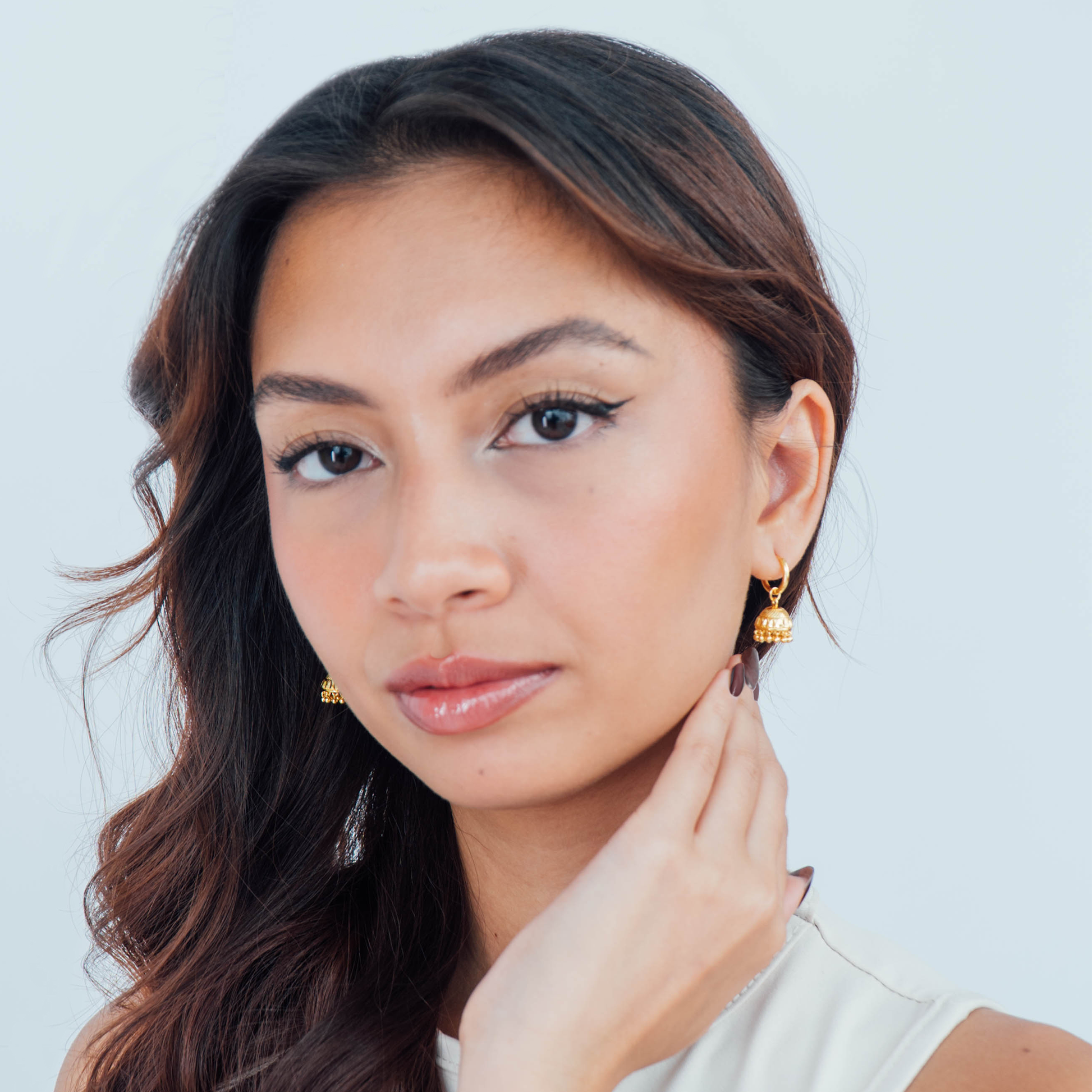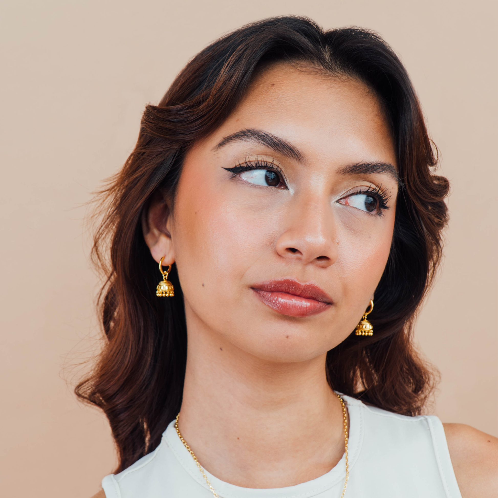 Mini huggies with 3D heart detail and wave texture for a modern take on the iconic Jhumka. Made from 18k gold plated eco brass.