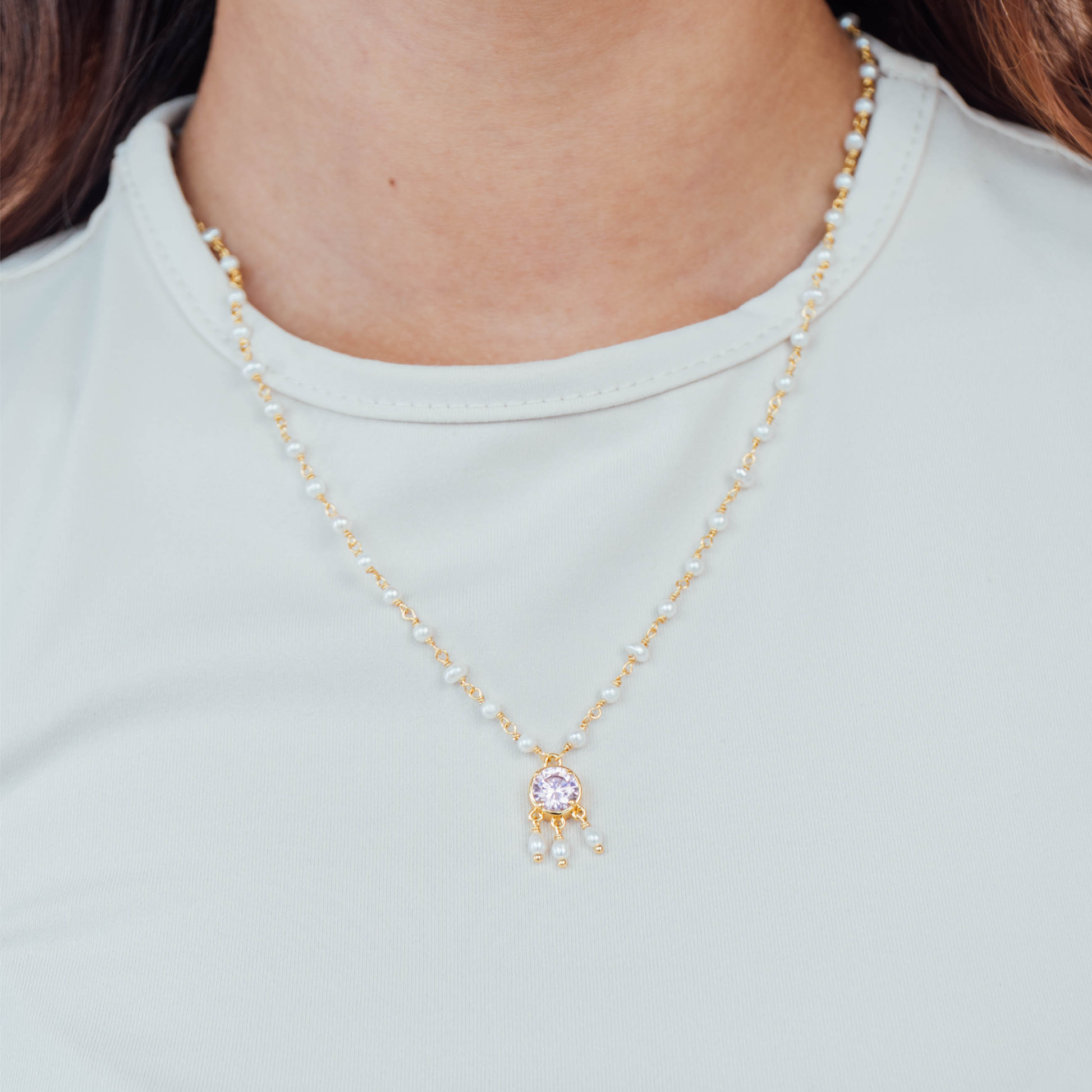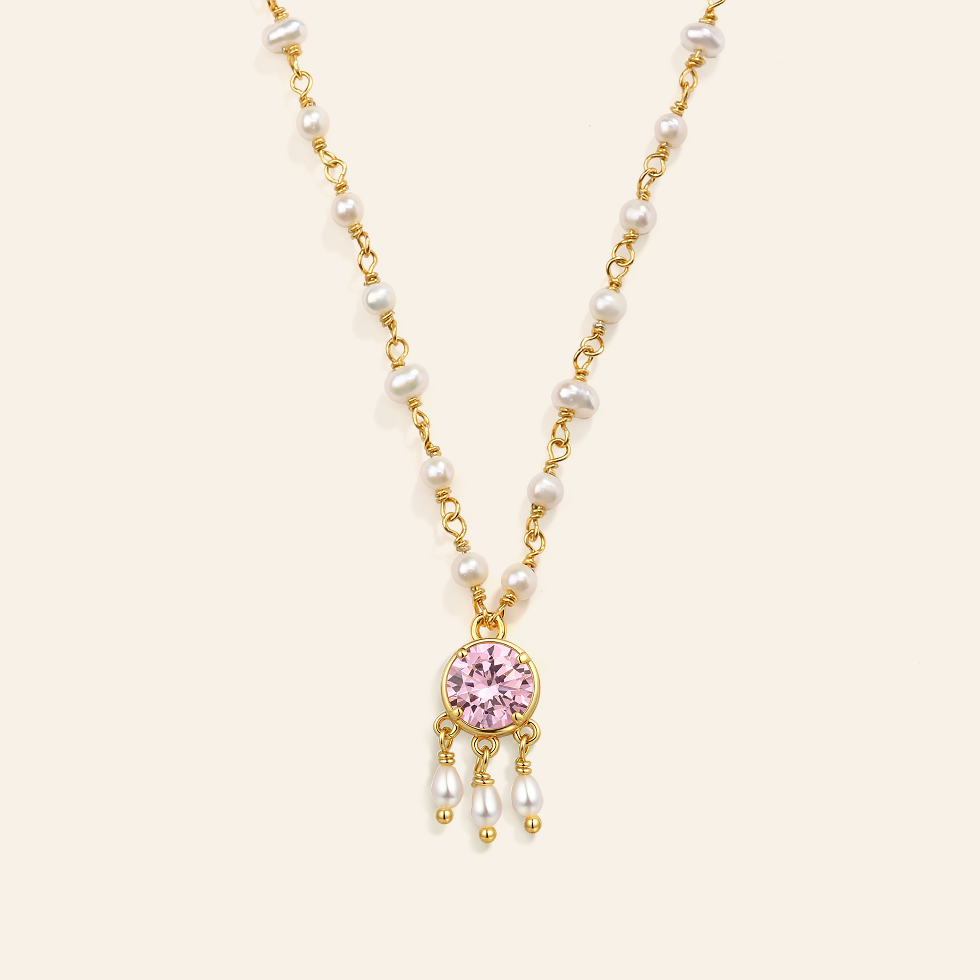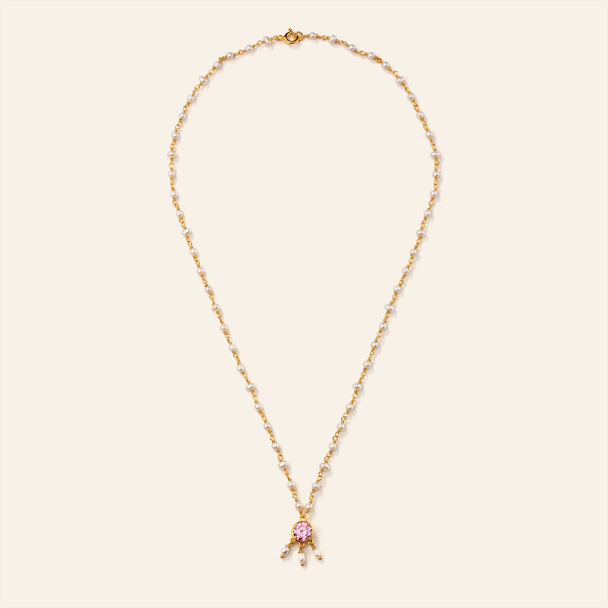 Hand-set pink cubic zirconia and freshwater pearl drops pendant, gold chain with freshwater pearl detail. All made from 18k gold plated eco brass.